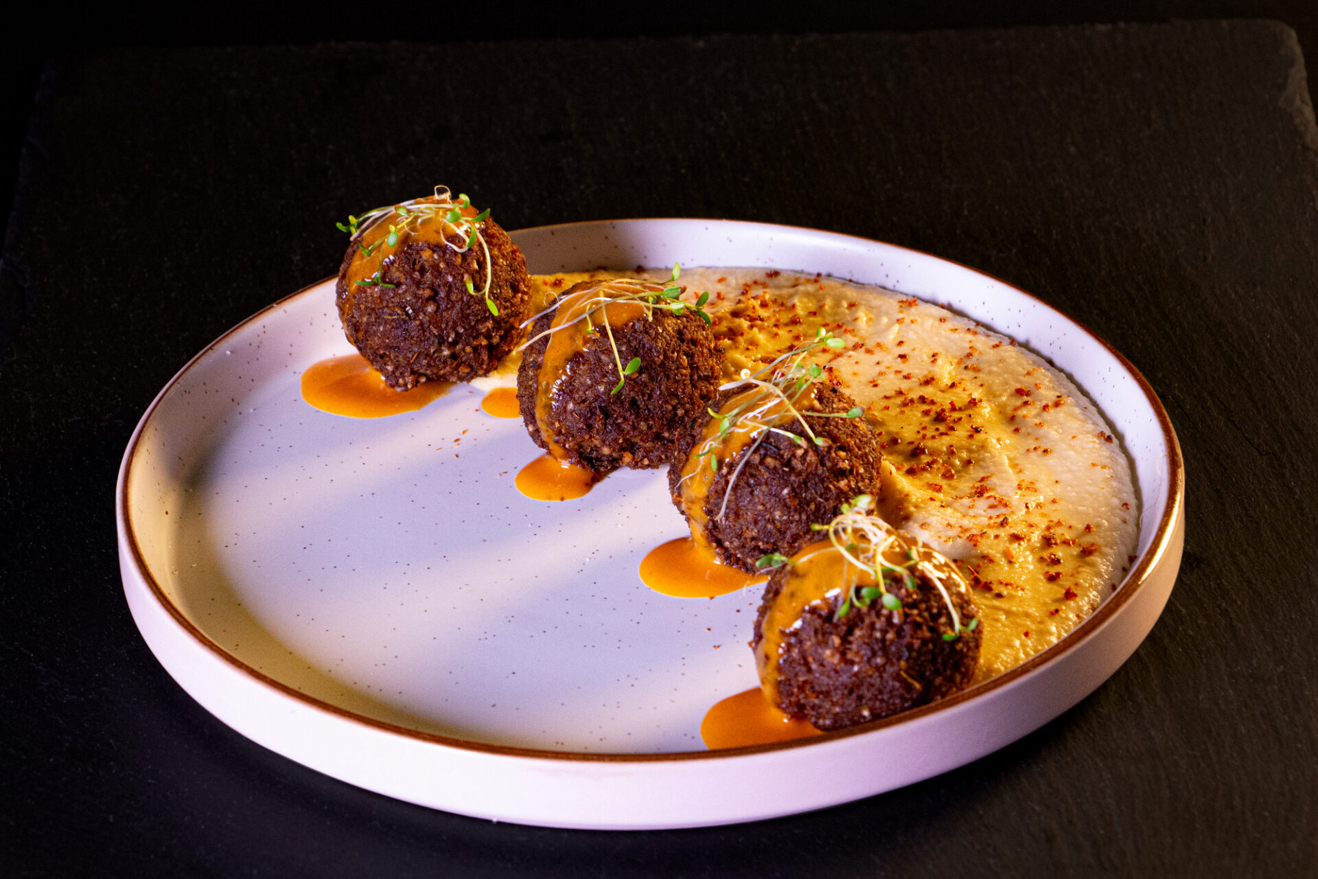 5 crocantes turrones de trigo rellenos de carne angus y pimienta turka, montados sobre un puré de garbanzos y con una mayo de siracha